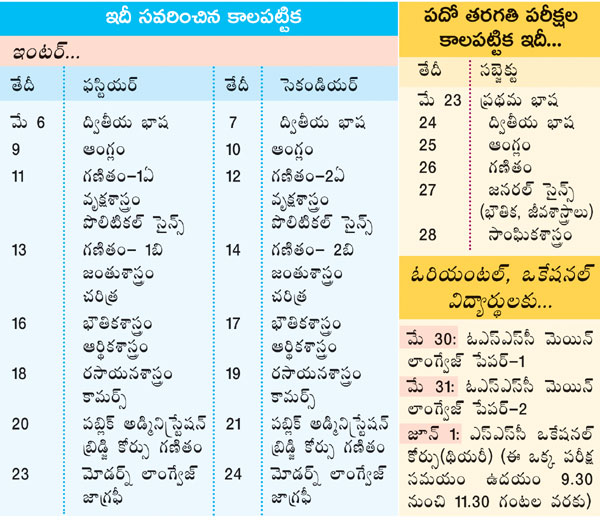హైదరాబాద్: ఇంటర్ పరీక్షలు మే 6వ తేదీ నుంచి.. పదో తరగతి పరీక్షలు మే 23 నుంచి ప్రారంభం కానున్నాయి. జేఈఈ మెయిన్ తొలి విడత తేదీల్లో మార్పు చేసిన నేపథ్యంలో రాష్ట్రంలో వార్షిక పరీక్షల తేదీలను సవరిస్తూ ఇంటర్, ఎస్ఎస్సీ బోర్డుల అధికారులు బుధవారం కొత్త కాలపట్టికలను విడుదల చేశారు. జేఈఈ మెయిన్ తొలి విడత పరీక్షలు మే 4వ తేదీతో ముగుస్తాయి. ఈ క్రమంలో 6వ తేదీ నుంచి ఇంటర్ ప్రథమ సంవత్సరం పరీక్షలు మొదలుకానున్నాయి. సైన్స్ విద్యార్థులకు మే 19న పరీక్షలు పూర్తవుతాయి. ఆ తర్వాత మే 24న ప్రారంభమయ్యే జేఈఈ మెయిన్ రెండో విడతకు నాలుగు రోజుల వ్యవధి ఉంటుంది. ఇంటర్ అన్నీ పరీక్షలు మే 24న ముగుస్తాయి. మే 23న ప్రారంభమయ్యే పదో తరగతి ప్రధాన పరీక్షలు వరుసగా 6 రోజులు జరగనున్నాయి.