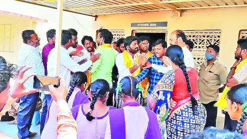 ఆదోని నేరవార్తలు, న్యూస్టుడే : ఆదోని పట్టణంలోని ప్రభుత్వ బాలికల ఉన్నత పాఠశాలలో బుధవారం మధ్యాహ్న భోజనం పరిశీలన కార్యక్రమం ఉద్రిక్త పరిస్థితులకు దారితీసింది. టీఎన్ఎస్ఎఫ్, వైకాపా నాయకుల మధ్య వాగ్వాదం, తోపులాట చోటుచేసుకుంది. స్థానిక ప్రభుత్వ బాలికల ఉన్నత పాఠశాలలో మధ్యాహ్న భోజన పథకం నిర్వహణ, పాఠశాలలో మౌలిక వసతుల పరిశీలనకు టీఎన్ఎస్ఎఫ్ కర్నూలు పార్లమెంటు అధ్యక్షుడు రామాంజనేయులు, కోటేశ్వరరావు, తేజ తదితరులు వెళ్లారు. వారు మధ్యాహ్న భోజనం పరిశీలిస్తుండగా.. ఈ విషయాన్ని తెలుసుకున్న వైకాపా ఆదోని పట్టణ అధ్యక్షుడు దేవ, చలపతి, చంద్రశేఖర్రెడ్డి తదితరులు అక్కడికి చేరుకొని టీఎన్ఎస్ఎఫ్ నాయకులతో వాగ్వాదానికి దిగారు. మీరు పాఠశాలకు ఎందుకొచ్చారు. ఇక్కడికి కండువాలు, బ్యానర్లు తీసుకురాకూడదు, ఇక్కడి నుంచి వెళ్లిపోవాలని చెప్పారు. ఈ క్రమంలో ఇరువర్గాల మధ్య తోపులాట జరిగింది. ఘర్షణ వాతావరణం చోటుచేసుకోవడంతో విద్యార్థినులు, ఉపాధ్యాయులు ఆందోళనకు గురయ్యారు. కాసేపటికి గొడవ సద్దుమణిగింది. ఈ సందర్భంగా టీఎన్ఎస్ఎఫ్ అధ్యక్షుడు రామాంజనేయులు, కోటేశ్వరరావు మాట్లాడుతూ.. తాము పాఠశాలలో పరిశీలనకు వెళితే వైకాపా నాయకులు వచ్చి బయటకు వెళ్లాలంటూ దాడికి ప్రయత్నించారని ఆరోపించారు.